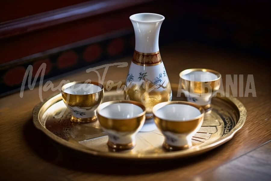 Raki ist zwar kein Lebensmittel, aber eine traditionelle albanische Spirituose, die aus destillierten Trauben oder Pflaumen hergestellt wird. Er wird oft als Aperitif oder Digestif zu einem schmackhaften albanischen Essen getrunken.