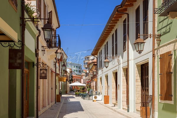 Vlora Typische Straße im historischen Zentrum mit bunten Gebäuden.