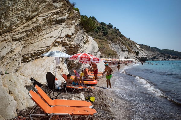 Ksamil, Albanien, 5. Juli 2022 Badende an einem felsigen Strand