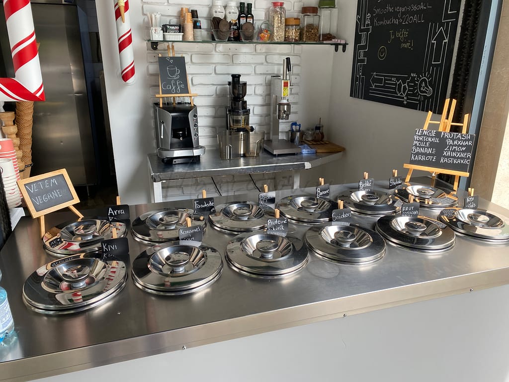 Ce magasin de glaces est un endroit charmant situé près du centre, qu'il faut absolument visiter à Tirana. Avec une variété d'options végétaliennes, y compris cinq parfums différents de crème glacée végétalienne, la sélection ne déçoit pas. Le personnel sympathique, qui parle couramment l'anglais, offre un excellent service et peut même traduire les parfums pour vous. Avec une vaste sélection de glaces végétaliennes à base d'avoine, dont des parfums tels que figue, fruit de la passion, chocolat, melon, ananas, caramel salé, pêche, noix, framboise et yaourt, cet endroit est vivement recommandé aux végétaliens comme aux non-végétaliens.