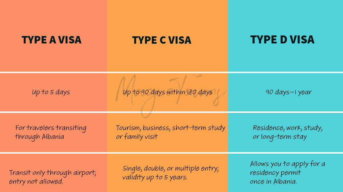 L'Albanie propose des visas de courte et de longue durée, respectivement de type "C" et de type "D". Les visas de type "C" sont destinés aux séjours de courte durée, tandis que les visas de type "D" permettent des séjours plus longs. En outre, il existe un visa de transit aéroportuaire spécial, de type "A", pour les personnes qui traversent l'Albanie en route vers une autre destination.