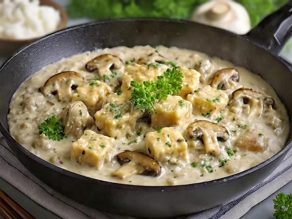 - In una pentola capiente scaldare i restanti 2 cucchiai di olio d'oliva; una volta caldo, aggiungere la farina e cuocere a fuoco medio-basso finché non diventa spumosa. Togliere dal fuoco e aggiungere il brodo, lo yogurt e la curcuma in polvere. Aggiungere il composto di tofu e funghi e mescolare per amalgamare il tutto.